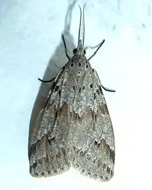 The length of the forewings is 13โ16 mm. Adults are cream coloured with brown mottling and darker shades as well as a few black dots in the basal, medial and post medial areas on the forewings.