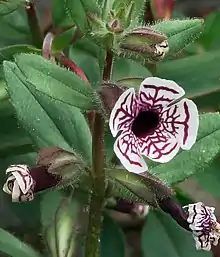 The tubular base of the flower is encapsulated in a dark reddish calyx of sepals with uneven lobes. The five-lobed flower has a maroon throat and the circular face is white with bold and intricately patterned purple-brown veining.[7] The bloom period varies from March to May.[7]