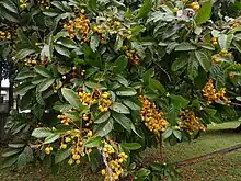 The inflorescence is a large panicle produced in the leaf axils, carrying numerous flowers and measuring about 26 cm (10 in) long.[5][6] The flowers are small, around 5 mm (0.20 in) diameter, with 4 or 5 petals and 8 stamens.[5][7]