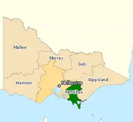 The Division of McMillan was an Australian Electoral Division in the state of Victoria. It was located in the western part of the Gippsland region, which extends for the length of Victoria's eastern Bass Strait coastline. It included the outer south-eastern Melbourne suburb of Pakenham, and also included the towns of Warragul, Moe, Wonthaggi, Leongatha and Foster. It stretched from Mount Baw Baw and the Baw Baw National Park in the north to Wilsons Promontory, and the Wilsons Promontory National Park in the south. It was the southernmost electoral division in continental Australia. It was replaced by the Division of Monash in 2019.