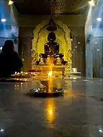 On Diwali morning, Nirvan Ladoo is offered after praying to Lord Mahavira in all Jain temples across the world.[4] The most important principle of Jains is Ahimsa or non violence, thus they tend to avoid firecrackers during Diwali as they cause harm to living organisms. Diwali is celebrated in atmosphere of austerity, simplicity, serenity, equity, calmness, charity, philanthropy and environment-consciousness. Jain temples, homes, offices, and shops are decorated with lights and diyas. Relatives distribute sweets to each other. The lights are symbolic of knowledge or removal of ignorance. Swetambar Jains observe two days of fasting in remembrance of the penance and sacrifice of Mahavira. In temples and homes, devotees sing and chant hymns and mantras from Jain religious texts in praise of the Tirthankar and congregate for a prayer and recite verses from the Uttaradhyayan Sutra which contain the last teachings of Mahavira. Jains pay visit to Pawapuri, Nalanda in Bihar on this special day to offer their prayers. The Jain year starts with Pratipada, next day of Diwali.[5]
