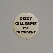 Campaign buttons had been manufactured years before by Gillespie's booking agency as a joke[7] but proceeds went to Congress of Racial Equality and the Southern Christian Leadership Conference headed by Martin Luther King Jr.;[8] in later years they became a collector's item.[9]