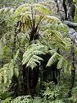 In Korsaröd there where found frashwater algae that suggest also a river influence.[101] The data provided by the fossilized wood rings showed that the location of Korsaröd hosted a middle-latitude Mediterranean-type biome in the late Early Jurassic, with low rainfall. Superimposed on this climate were the effects of a local active Strombolian Volcanism and hydrothermal activity. This location has been compared with modern Rotorua, New Zealand, considered an analogue for the type of environment represented in southern Sweden at this time. The locality was populated mostly by Cupressaceae trees (including specimens up to 5 m in circunference), known thanks to the great abundance of the wood genus Protophyllocladoxylon and the high presence of the genus Perinopollenites elatoides (also Cupressaceae) followed by Eucommiidites troedsonii (Erdtmanithecales).[77] Volcanogenic deposits are dominated by cypress family pollen with an understorey component rich in putative Erdtmanithecales, both representing vegetation of disturbed habitats. The abundance of Protophyllocladoxylon sp. is also related with a sporadic intraseasonal and multi-year episodes of growth disruption, probably due to the volcanic action, with rapid permineralization of woody remains, suggesting that the vegetation grew in a hydrothermal region, with major challenges for roots to cope with warm, mineral-laden fluids percolating through the soil.[102] Pollen, spores, wood and charcoal locally indicate a complex forest community subject to episodic fires and other forms of disturbance in an active volcanic landscape under a moderately seasonal climate.[103] Osmundastrum pulchellum, the best preserved fossil identified in this unit (whose rhizome hosts epiphytes, micro-herbivores, parasites, saprotrophs and fine organic remains) were a prominent understorey element in this vegetation and were probably involved in various competitive interactions with neighboring plant species, such as Lycophytes, whose roots have been recovered inside the Rhizome.[103] The ferns where part of a fern and conifer rich vegetation occupying a topographic depression in the landscape (moist gully) that was engulfed by one or more lahar deposits.[103]