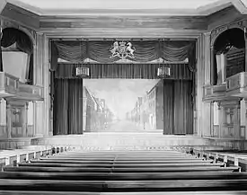 After the Civil War, the Planter's Hotel fell into disrepair and was slated for demolition. However, in 1935, at the height of the Great Depression, after Milton Pearlstine made the property available to the City of Charleston and at the urging of Mayor Burnet Maybank and other notable citizens, the original building became a Works Progress Administration project. At that time, the present theatre was constructed within the shell of the Planter's Hotel. The hotel's grand foyer became the grand foyer of the theatre, and the hotel's dining room now serves as the box-office lobby. Douglas Ellington served as the architectural advisor for the project;[5] Charleston architects Simons & Lapham then supervised the daily work while Ellington was in Washington, D.C.[6] The woodwork and mantels of the second floor drawing room were salvaged from the Radcliffe-King Mansion (circa 1799), which stood at the corner of George and Meeting streets and was razed to build the College of Charleston gymnasium, another WPA project. Modeled on 18th century London playhouses by Charleston architect and pioneering preservationist Albert Simons, the present Dock Street Theatre's stage house and auditorium were built in the hotel's courtyard. The local carpenters, who were put to work as a part of this Depression-era relief effort, used locally grown and milled native black cypress for the wooden interior. Following this $350,000 renovation, The Historic Dock Street Theatre's second grand opening took place on November 26, 1937. Notables in the audience included author DuBose Heyward (Porgy), who was named writer-in-residence.
