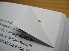 A dog ear is a folded down corner of a book page. The name refers to the ears of many breeds of domestic dog flapping over.[1] A dog ear can serve as a bookmark. Dog-earing is also commonly used to mark a section or phrase in a book that one finds to be important or of personal meaning. Other names for this practice include page folding and corner turning.[2] The practice is generally frowned upon by those that want to preserve books in their original condition.[3] It is also sometimes used to keep sheets of paper together, in the absence of a stapler or paper clip.