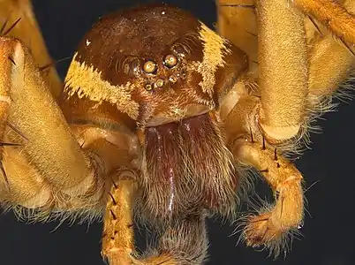 This species is one of four species of Dolomedes found in New Zealand, and grows up to 7 cm across, including legs.[3][5] It has yellow stripes down its cephalothroax, which is dark orange-brown where D. aquaticus is grey.[3] It has distinctive features of the male pedipalps and female genitalia, but can easily be distinguished from other Dolomedes species by the stripes down each side of the abdomen, which are light yellow-brown with several patches extending a little way towards the midline.[1] Body length is 12–18 mm in males, 18–25 mm in females.[1] Because they weigh less than a gram and are covered with hydrophobic hairs, these spiders can walk on the water surface without sinking.[3]