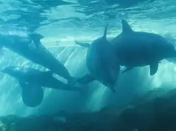 ![]() The underwater viewing area with bottlenose dolphins at SeaWorld Orlando | |