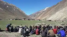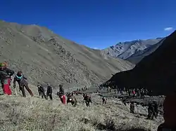 Agriculture is possible at heights of 3,800 to 4,180 metres (12,470 to 13,710 ft) (villages of Shimen Panzang Valley and Chharka, respectively) but often requires irrigation.[1]:22 Apart from barley, crops include buckwheat, millet, mustard, wheat, potatoes, radishes,[1]:22 and spinach. Similar to transhumance in the Alps, the population migrates between villages and high-lying (4,000 to 5,000 metres or 13,000 to 16,000 feet) summer pastures, in a lifestyle referred to as samadrok (roughly "farming nomads").[1]:44,50