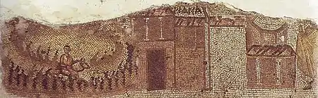 The only known possible depiction of the Domus Aurea is the Megalopsychia Hunt Mosaic, or "Yakto mosaic", from the second half of the fifth century,[4] found in the ancient suburb of Antioch, Daphne (Yakto). Part of the border of this hunt scene shows buildings from Antioch, including those interpreted to be the Imperial Palace and the Domus Aurea. Although there is an octagonal building on part of the border it remains uncertain if this represents the great church or whether the relationship to other buildings can be used to identify its location on the island.[3] In the absence of definitive pictorial evidence, it is necessary to rely on written descriptions of the building. Eusebius in his Life of Constantine, describes the Domus Aurea as being octagonal in plan, sited in a large enclosure, with many chambers clustered around it. The domed roof, which was made of wood,[5] reached a great height and was gilded inside. The floor consisted of polished marble and every part of the building was highly decorated with brass, gold and precious stones. It has been proposed that it was similar in structure to the Basilica of San Vitale in Ravenna, which was built in 540.[6]
