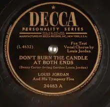 "Don't Burn the Candle at Both Ends" is a song written by Benny Carter, Irving Gordon, and Louis Jordan. It was performed by Louis Jordan and his Tympany Five, recorded in December 1947 and released on the Decca label (catalog no. 24483-A).[1] The "B" side of the record was "We Can't Agree".[2]