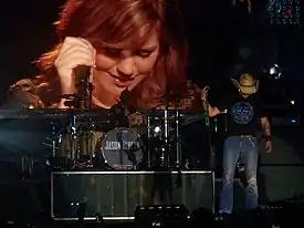 On November 10, 2010, Aldean performed the song with Clarkson for the first time at the 44th annual Country Music Association Awards at Bridgestone Arena in Nashville, Tennessee.[6] Despite receiving a standing ovation,[3] their performance of the song in that event was graded as a "D" in the Los Angeles Times, noting that the song is "a ballad that turned into some oddly orchestrated '80s hair metal tune. It’s an easy slam, but this is "American Idol" bombast."[50] Aldean and Clarkson also performed the song on several other occasions. They sang the song on The Ellen DeGeneres Show on February 22, 2011.[51] On April 14, 2011, they performed the song live on the tenth season of American Idol during the Top 8 results show.[52] They later performed the song live during Country Music Association festival in Nashville, Tennessee on June 9, 2011.[53] Aldean also performed the song on all venues of his concert tour, the My Kinda Party Tour, which started on January 21, 2011. During each performance, Clarkson is seen on a big screen behind Aldean, singing her part of the duet.[54] He explained,