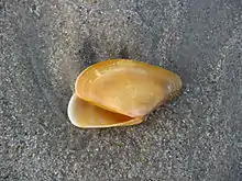 Donax vittatus lives close to the surface of sandy beaches, extending its two siphons to the surface. When the tide is in, water is drawn in through one siphon and expelled through the other. Donax vittatus is a filter feeder and, at the same time that oxygen is being extracted from the water stream by the gills, food particles are captured and passed by cilia to the mouth. If the animal is disturbed or exposed by the scouring action of the waves, it can burrow rapidly. It does this by protruding its foot downwards, enlarging it by pumping blood into it and then using it as an anchor to pull itself deeper into the sand.[2][4] Under water video-recording of Donax vittatus show that it is most active around the time of low water, when the sediment is most disturbed. Individuals were shown to "leap" and to be dragged around on the surface by wave currents before reburying themselves.[5] At this time they are at risk of being eaten by gulls, and evidence that the birds consume large numbers of the shells is provided by the "gobbets" they sometimes leave on the beach, composed of the regurgitated inedible remnants of their meal and in which many broken shells of Donax vittatus can sometimes be found.[6] Donax vittatus is also preyed on by starfish, various gastropod molluscs and fish such as flounders.[7]
