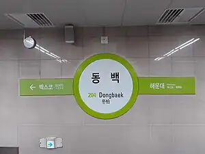 Dongbaek station (Korean: 동백역; Hanja: 冬柏驛) is a station on the Busan Metro Line 2 in U-dong, Haeundae District, Busan, South Korea. The station is located near the Dongbaekseom Island.