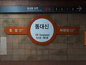 Dongdaesin Station (Korean: 동대신역; Hanja: 東大新驛) is a station of the Busan Metro Line 1 in Dongdaesin-dong, Seo District, Busan, South Korea.