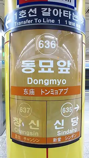 Dongmyo Station is a station on the Seoul Subway Line 1 and Line 6. It is named after a nearby shrine, built during the Joseon dynasty to honor Guan Yu, arguably the most famous Chinese military general from the Three Kingdoms era.