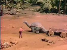 Holly trains Dopey to pull a cart, and during the night sneaks out to sleep with the apatosaur. The next morning Grumpy returns, but the Marshalls are able to drive him off with the "flyswatter." Rick decides that Dopey must be sent back to his own kind. After breakfast, the family leads Dopey to the swamp, where he joins a mother dinosaur the Marshalls have named "Emily."