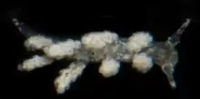 Body is narrow and elongate.[1] Rhinophores are smooth with tight rhinophoral sheaths.[1] Cerata are with rounded tubercles; apical tubercles are much larger than the rest.[1] Cerata are spaced out along the dorsum.[1] Background color is translucent gray with a series of opaque white spots on the dorsum.[1] Cerata are with cream or white extensions of the digestive gland.[1] The body size is up to 4 mm.[1]
