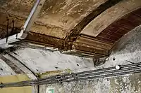 After the station was closed it was almost immediately modified. The western headwalls of both platform tunnels were rebuilt to allow a step plate junction to be installed,[n 4] providing access from the eastbound and westbound tunnels to a new siding located between Down Street and Hyde Park Corner. The siding is mainly used to reverse westbound trains, but could also be used for servicing trains. The siding tunnel is accessible at its western end through a small foot tunnel constructed from Hyde Park Corner station.[8] The lifts were removed and the shafts adapted to provide additional tunnel ventilation.[9]