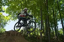 A downhill bike (also known as a downhill mountain bike) is a full suspension bicycle designed for downhill cycling on particularly steep, technical trails. Unlike a typical mountain bike, durability and stability are the most important design features, compared to lighter, more versatile cross-country bikes. Downhill bikes are primarily intended for high-speed descent, and downhill riders will usually push, or shuttle via chairlifts or motorized vehicles, to the trailhead.[1] Downhill bikes share similarities with freeride bikes due to their large strong frames and increased travel.[1]