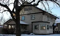 The Dr. J. W. S. Gallagher House is essentially rectangular, with a gabled porch on the side and another on the rear. It is two stories with side gables, a low-pitched roof, and wide eaves. The house has stucco walls with cypress trim.[3] Architectural details include a five-sided bay window on the northeast corner, sawn wood decorations, and came glasswork windows.[4] It was nominated for being a well-preserved example of the modest residential commissions that typified Purcell & Elmslie's work, despite their acclaim for more prominent projects such as Merchants National Bank in downtown Winona.[3]