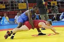Dremiel Byers (top) lifts an opponent at the 2008 Summer Olympics.