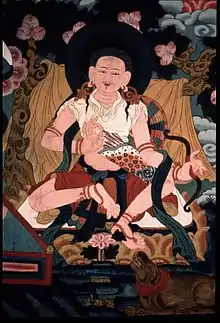 Drukpa Kunley (1455–1529), also known as Kunga Legpai Zangpo, Drukpa Kunleg (Tibetan: འབྲུག་པ་ཀུན་ལེགས་, Wylie: brug pa kun legs), and Kunga Legpa, the Madman of the Dragon Lineage (Tibetan: འབྲུག་སྨྱོན་ཀུན་དགའ་ལེགས་པ་, Wylie: 'brug smyon kun dga' legs pa), was a Tibetan Buddhist monk, missionary, and poet in the Drukpa Kagyu lineage of the Mahamudra tradition.[1] He was trained at Ralung Monastery under siddha Pema Lingpa. However, by the age of 25, he had returned his monastic vows[2] to take a wife, whose name was Tsewang Dzom (tshe dbang 'dzom).[3] He is often counted among the Nyönpa ("mad ones").