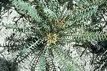 Banksia nana, commonly known as dwarf dryandra,[2] is a species of shrub that is endemic to a small area in the south-west of Western Australia. It has underground stems, pinnatipartite leaves with sharply-pointed lobes, pale green or yellow flowers and broadly egg-shaped follicles.