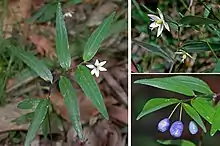 A herbaceous perennial that spreads by rhizomes, it typically grows up to 50cm with an arched and sometimes branching stem. Leaves are lanceolate to 8cm long with a prominent midrib, dark green in colour, sitting horizontal and alternate along the stem. Flowering occurs from November-January.[2] Flowers are creamy white in colour arising from leaf axils, they sit pendulous beneath the stem, are typically 1.5cm in diameter and star shaped. The flowers have 6 pointed petals and 6 stamens with oblong anthers. The stamens are typically shorter than the perianth segments, with a three-lobed ovary. The fruits are oblong or heart-shaped, 1-1.5cm in diameter and turquoise-blue in colour containing numerous seeds.[3] In Tasmania, there are no species that look similar making this an easy plant to identify in the field.
