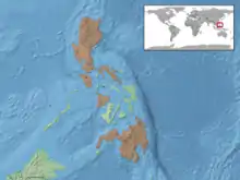 Dryophiops philippina is endemic to the Philippines, where it is found in the islands of Luzon (including Bataan), Mindoro, Sibuyan, Panay and eastern Mindanao (Diuata Range). On Panay it has been recorded within primary and secondary lowland tropical moist forests, and in areas nearby. This species might need forest cover for refuge.[1]