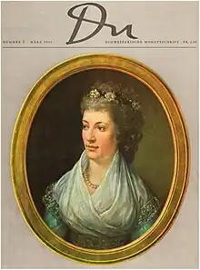 In his first editorial, Kübler wrote about the topic German: Du ("You"), and how the name of the magazine was chosen.[3][9] Other titles discussed were Windstärke 13,[3] Elan, Niveau and Terra, but Kübler insisted on Du in the discussions within the editorial board.[10] The first issue included a page with several poems titled Du.[4] Between 1941 and 1958, Du was published with the subtitle Schweizer Monatsschrift (Swiss Monthly), then under Manuel Gasser as editor-in-chief the magazine used the subtitle Kulturelle Monatsschrift (Cultural Monthly), and Dominik Keller introduced the Europäische Monatsschrift (European Monthly) in 1975.[10]