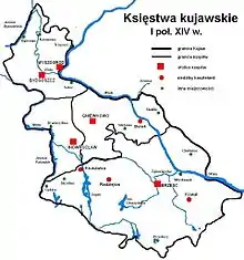 Kazimierz III died between 1347 and 1350 and was succeeded by his son, Władysław the White.[3][5][6] He kept positive relations with the State of the Teutonic Order and the king of Poland. In 1359, the duke married Elżbieta, daughter of Albert of Strzelce. With the marriage, he probably was given Inowrocław Land as his fiefdom from Casimir III the Great, the king of Poland, that before was part of the Duchy of Inowrocław. After the death of his wife between 1360 or 1361, the duke returned his fiefdom to the king. At the turn of 1363 and 1364, Władysław pawned the duchy to the king of Poland for the prize of 1000 florins.[3][5][6] This decision probably was caused by the worsening relations with the king of Poland, who, during the border dispute between the duke and the Kuyavian judge Kiwała, ruled in favour of the latter.[7][5][6]