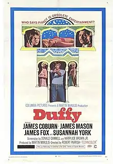 Duffy is a 1968 British-American comedy crime film directed by Robert Parrish and starring James Coburn, James Mason, James Fox and Susannah York.[1] Originally called "Avec-Avec", French for "with-it", according to 1967 press reports, Columbia Pictures changed the title of the movie, despite the protests of the stars.[2]