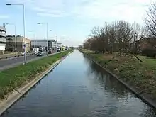 This section diverts a small proportion of water from the River Colne at Longford, south then eastwards to the River Crane. The shallow canal flows through the north of Stanwell, Bedfont and Feltham. For a large part of its early course, it flows alongside its younger "twin", the Longford River. The first part helped to irrigate fields and orchards of Longford, then those of Heathrow and Stanwell.[4] It was diverted west and then south in 1944 when Heathrow Airport was built.[5] Both minor "canals" were moved further under the building scheme for Heathrow Terminal 5. They skirt the western and southern perimeter of Heathrow Airport then diverge after The Two Bridges, which are bridges of the truck road-bypassed Hatton Road in Bedfont.[6]