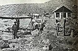 In 1862, Dun Glen was established after silver was discovered in the area.[1] The site was named for one of its early settlers, Angus Dun.[2] By 1863, the mining camp became a commercial center with a population of 250. It was the second largest commercial district in northern Nevada. Early on it was variously called Dunn Glen or Dunglen. However its post office, opened on July 18, 1865 was called Dun Glen, and it operated as such until April 7, 1894.[3]