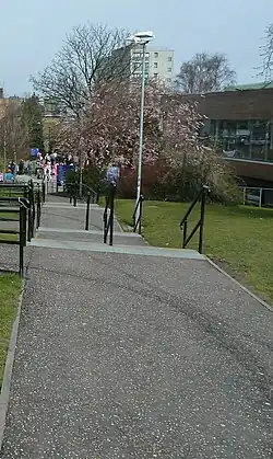 The facility has its origins in a dental club formed by the University College of Dundee in 1909.[1] The dental hospital itself was established by Sir George Baxter when he rented to flats in two villas in Park Place in 1914.[2] The hospital joined the National Health Service in 1948.[3] The villas were replaced with a large stone building, designed by Findlay, Stewart & Robbie, on the same site in 1952.[2] An extension in the form of a modern tower block, designed by Robbie & Wellwood, was opened the Queen Elizabeth The Queen Mother in 1968.[2]