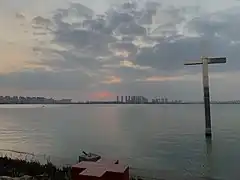 Dushu Lake (Chinese: 独墅湖) is a freshwater lake in the southern part of Suzhou Industrial Park. It is located in the junction of four towns: Guoxiang (郭巷), Chefang (车坊), Xietang (斜塘) and Loufeng (娄葑). The area of Dushu Lake is 9.19 square kilometers with an average depth of 6.5 meters.[1][2] The lake connects the Jinji Lake (金鸡湖) at its north end, the Fengmen Pond (葑门塘) at its west, and is fed by the Wusong River (吴淞江) from the south-east.[2] The earliest proof of possible human activity around Dushu Lake can be traced back 5500 years, according to an archaeology report conducted in 2001. The findings were significant in analyzing Suzhou's climate, geography, and environment in ancient times.[3] Suzhou Dushu Lake Higher Education Town is located by the east bank of the lake, and two tunnels run through the lake, connecting the east and west bank.[2]