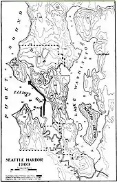 In 1895, Eugene Semple, who had earlier served as Governor of Washington Territory, outlined a plan for a series of major public works projects in the Seattle area, including the straightening and dredging of the Duwamish River, both to open up the area to commercial use and to alleviate flooding. In 1909 the City of Seattle formed the Duwamish Waterway Commission in order to sell bonds and oversee the re-channelling of the river. Work began in October, 1913, and the oxbows gradually disappeared, with a few recesses in the channel left to accommodate high water flows and turning ships. Parts of the Georgetown and South Park neighborhoods once on quiet riverbank found themselves inland; the Georgetown Steam Plant was now almost a mile from the river, and special water pumping facilities had to be installed. By 1920, 4½ miles of the Duwamish Waterway had been dredged to a depth of 50 feet, with 20 million cubic feet of mud and sand going into the expansion of Harbor Island.[8] The shallow, meandering, nine-mile-long river became a five-mile engineered waterway capable of handling ocean-going vessels.[9]