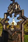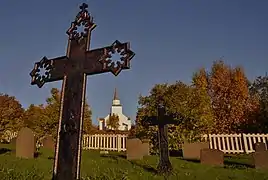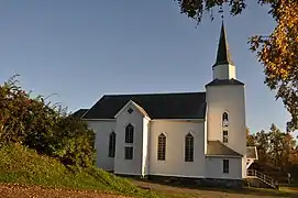 In 1880, a new long church was built about 60 metres (200 ft) to the northwest of the older church. The new building had a tower on the west end. After the new church was in use, the old church was torn down. The cemetery by the old church is still in use, a short distance from the new church building.[5]