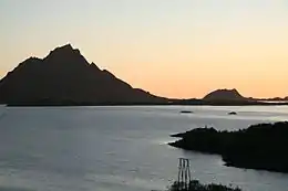 Dyrøya is a small island in Øksnes Municipality in Nordland county, Norway. It is located off the west coast of the large island of Langøya in the Vesterålen archipelago. The small islands of Nærøya and Tindsøya lie to the west and the island of Skogsøya lies to the north. The 6.5-square-kilometre (2.5 sq mi) island has one village, Barkestad, and there are only 4 residents on this island (in 2017). There are no road connections to the island, so all residents must use boats. The highest point on the island is the 562-metre (1,844 ft) tall mountain Blåtinden.[1]