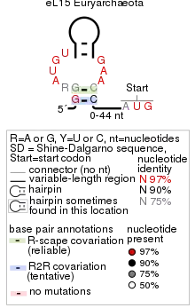 An eL15 ribosomal protein leader is a ribosomal protein leader involved in ribosome biogenesis. It is used as an autoregulatory mechanism to control the concentration of the ribosomal protein eL15, which is used in archaea and eukaryotes. Known Examples were predicted in Euryarchaeota with bioinformatic approaches.[1] The structure is located in the 5′ untranslated regions of mRNAs encoding ribosomal proteins eL15 (rpl15e).[1] Similarities between the eL15 ribosomal protein and the rRNA site to which this protein binds were detected.[1]