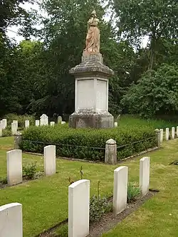 There are casualties of the South African War buried in the original cemetery. There are also 550 graves of service personnel that are registered and maintained by the Commonwealth War Graves Commission from the First (nearly 350) and Second World Wars (nearly 200). Nearly half of the First World War graves are in two military plots, one in the north-east and the other in the western sections of the cemetery. Land adjacent the latter was set aside for burying personnel in the Second World War, forming a combined World Wars section with a Cross of Sacrifice a focal point. There is also a special memorial to a serviceman buried among civilian air raid casualties whose grave could not be individually marked by a headstone.[7]