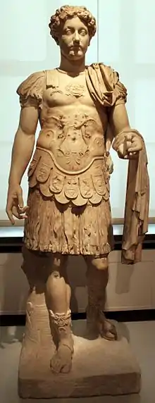 ![]() Marble statue of a young Marcus in military garb, wearing the muscle cuirass, Altes Museum, Berlin | |||||
