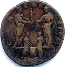 In April 145, Marcus married Faustina, as had been planned since 138. Since Marcus was, by adoption, Pius' son, under Roman law he was marrying his sister; Pius would have had to formally release one or the other from his paternal authority (his patria potestas) for the ceremony to take place.[96] Little is specifically known of the ceremony, but it is said to have been "noteworthy".[97] Coins were issued with the heads of the couple, and Pius, as Pontifex Maximus, would have officiated. Marcus makes no apparent reference to the marriage in his surviving letters, and only sparing references to Faustina.[98]