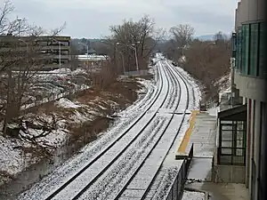 Conrail took over Penn Central on April 1, 1976. On September 26, 1994, some rush hour trains started to serve Worcester on Conrail trackage (which became CSX trackage on June 1, 1999), extending to other times beginning on December 14, 1996.[20] Prior to 2004, select Northeast Regional trains would offer a Springfield-Boston service via the so-called Inland Route. This route traveled northward from New Haven through central Connecticut and western Massachusetts, passing through Hartford and Springfield, then turned eastward and through Worcester and Framingham en route to South Station. With the electrification of the Northeast Corridor in 2000, Springfield–Boston service along the slower Inland Route (2:05 hours longer from Boston–New York City) was gradually reduced, with the last train discontinued in 2004.[3] The MBTA acquired the rest of the line from Framingham to Worcester as part of an agreement announced in 2009.[21] A 2012 agreement transferred ownership and control of the corridor from CSX to the Commonwealth of Massachusetts between Worcester and South Station in Boston .