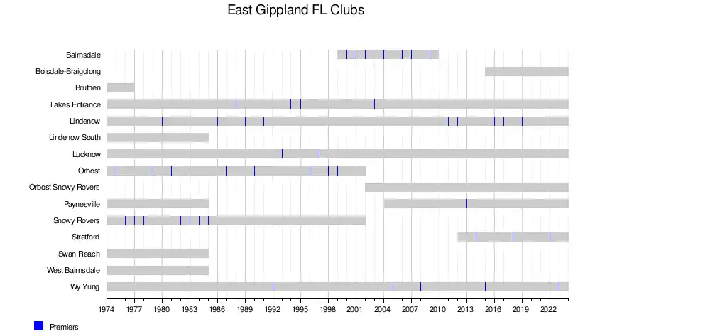 The East Gippsland FL in its present incarnation began in 1974 with the merger of the Gippsland Football League and the Bairnsdale District Football League. The league has had a number of clubs fold, merge, leave and return over its history, due partly to changing economic circumstances in the area, with areas such as Orbost losing large amounts of their population.