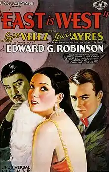 East Is West is a 1930 American pre-Code crime drama film produced and distributed by Universal. It was directed by Monta Bell and stars Lupe Vélez, Lew Ayres and Edward G. Robinson. It is based on a 1918 Broadway play, East is West, which starred Fay Bainter. A silent film version from 1922, also titled East Is West, starred Constance Talmadge.[1]