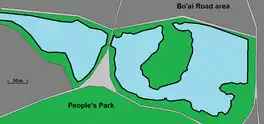 The two lakes are divided by a tree-lined walkway with a bridge at the north end. The north end of the bridge, where it meets the northern boundary, East Lake Road, is considered to be the north gate of People's Park. The eastern boundary of the lakes is Bo'ai South Road, the main northbound entry into the Bo'ai Road area.