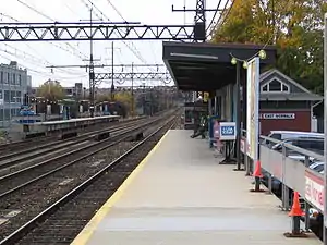 The station has two offset high-level side platforms, each four cars long, serving the outer tracks of the four-track Northeast Corridor.[8]:21 The platforms are offset, with the westbound platform west of East Street and the eastbound platform to the east.