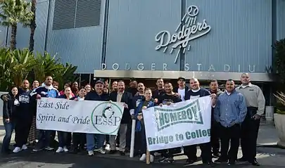 The East Side Spirit and Pride Organization together with representatives of Homeboy Industries outside of the Los Angeles Dodger Stadium