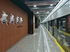 East Wuwei Road (simplified Chinese: 武威东路; traditional Chinese: 武威東路; pinyin: Wǔwēi Dōnglù) is a metro station on Line 15 of the Shanghai Metro. Located at the intersection of East Wuwei Road and West Taopu Road in Putuo District, Shanghai, the station was scheduled to open with the rest of Line 15 by the end of 2020.[1] However, the station eventually opened on 23 January 2021 following a one-month postponement.[2] It is located in between Gulang Road station to the north and West Shanghai Railway Station station to the south.